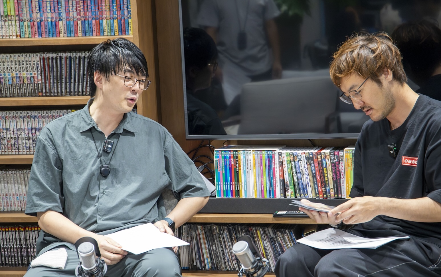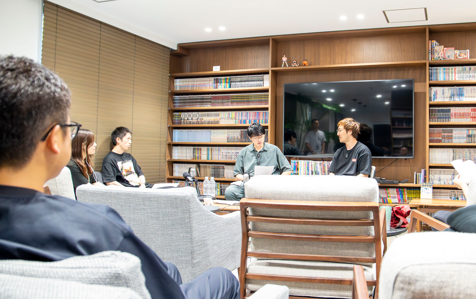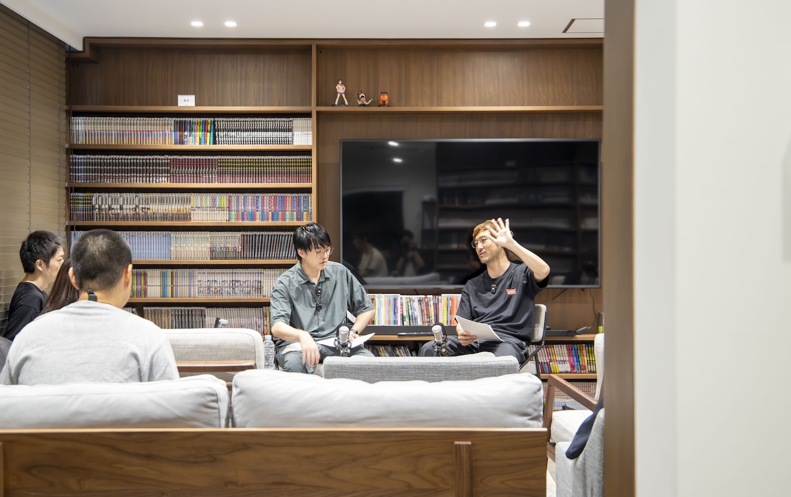 もちろん普段は外部の人は入れない漫画に集中出来る環境となっていますが、今回は特別にご協力いただき、リビングスペースにて収録を行わせていただきました。大きなモニターとソファーが並ぶ居住者の憩いの場となっており、様々なDVDやサブスクの視聴環境も整っています。